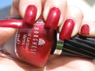 This is Borghese - Venetian Red. I got this at Rite Aid a few weeks ago for 75% off. This is 2 coats and it went on so easy! Nice and smooth like glass. And I love the deep rich shimmer! If you have a chance to pick it up on clearance I would grab it! I also have on a top coat of Poshe'. Love! 4.5 Blings
